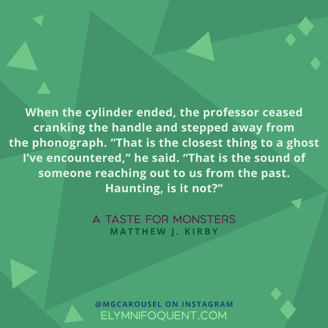 When th ecylinder ended, the professor ceased cranking the handle and stepped away from the phonograph. "That is the closest thing to a ghost I've encountered," he said. "That is the sound of someone reaching out to us from the past. Haunting, is it not?" —A TASTE FOR MONSTERS by Matthew J. Kirby